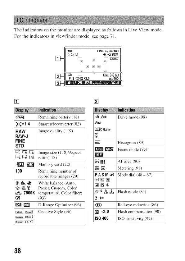 The indicators on the monitor are displayed as follows ill Live View' mode.