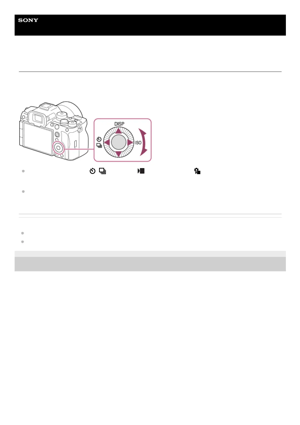The DISP (Display Setting), / (Drive Mode/ Self-timer), and ISO ( ISO) functions are assigned to the