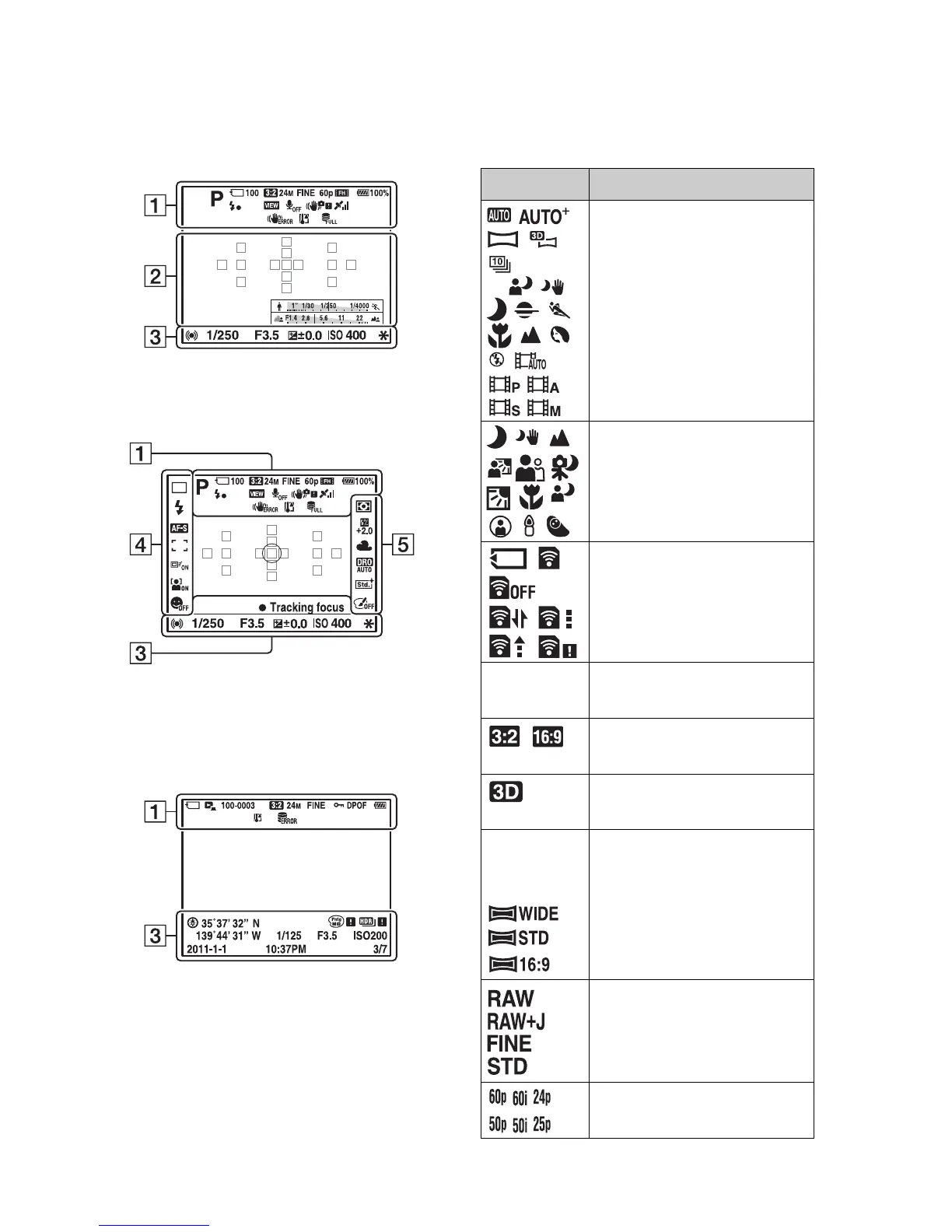 Sony Alpha SLT-A65 - List of Icons on the Screen