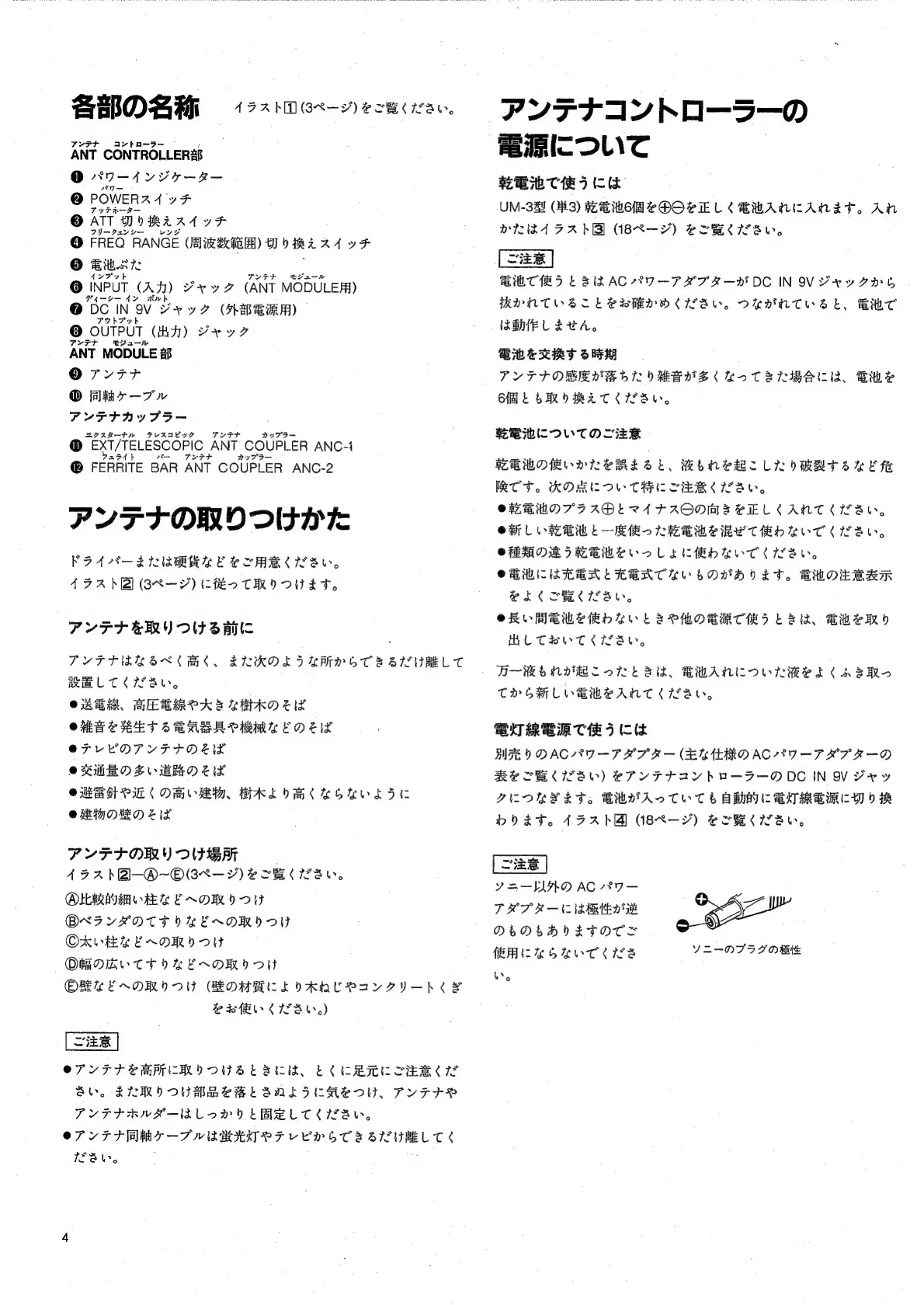Sony AN-1 - Names of Each Part; ANT CONTROLLER Section; ANT MODULE Section; How to Install the Antenna