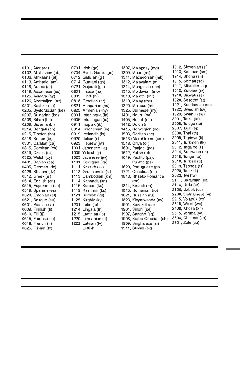 Sony AT100 - Language Code List; Country;Area Code