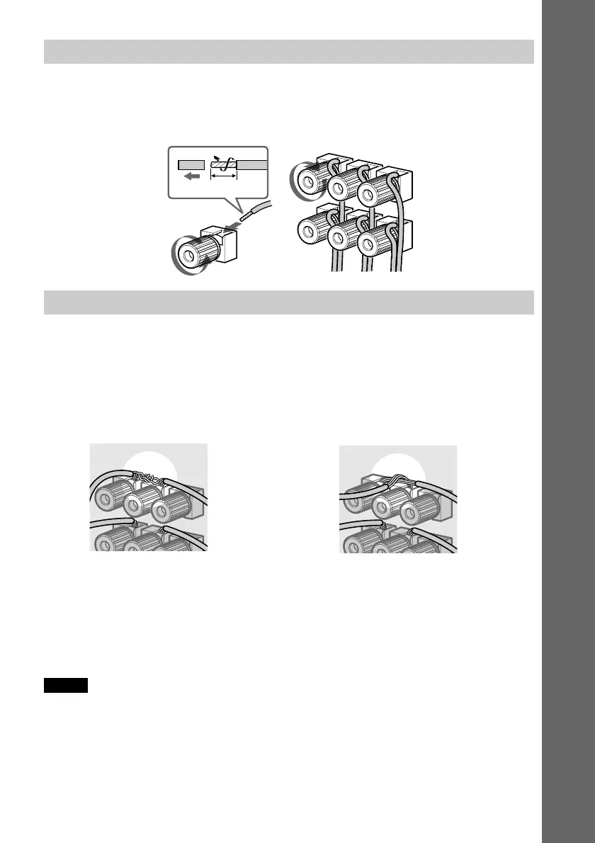 • When connecting the stripped ends of the speaker cords, make sure the ends do not touch each other or