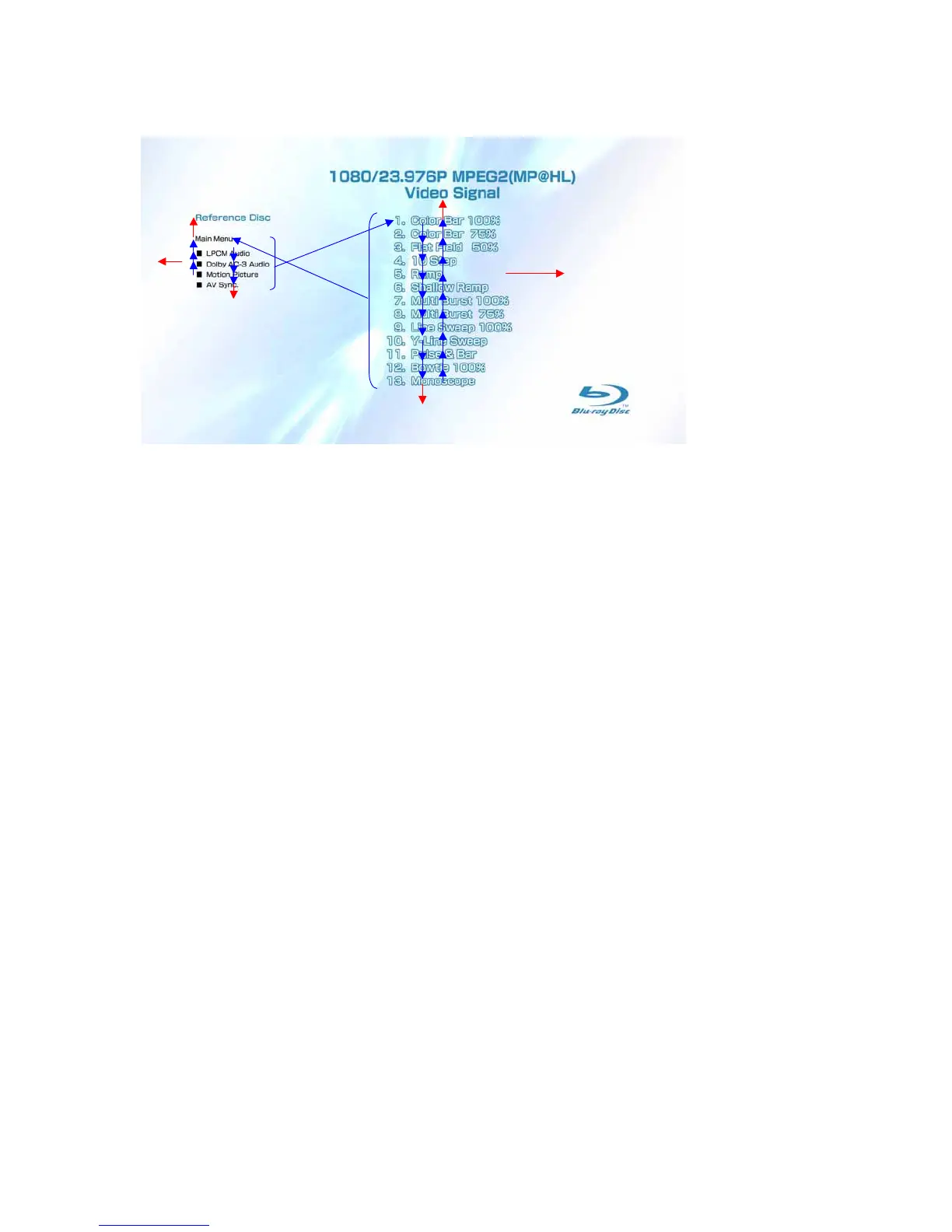 2) Selection of 1. Color Bar 100% t Return to Sub menu2 after seamless playback from T43_C1 to T43_C13. 1. Color Bar 100% is