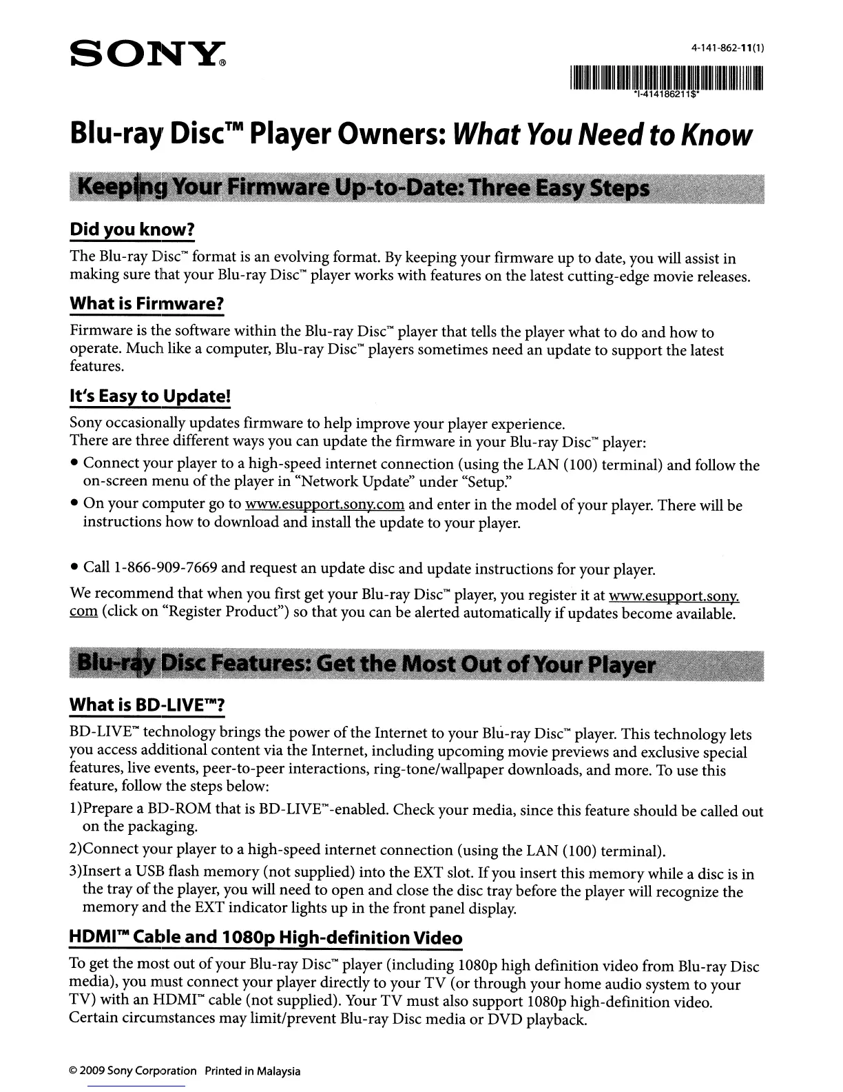 • Call 1-866-909-7669 and request an update disc and update instructions for your player.