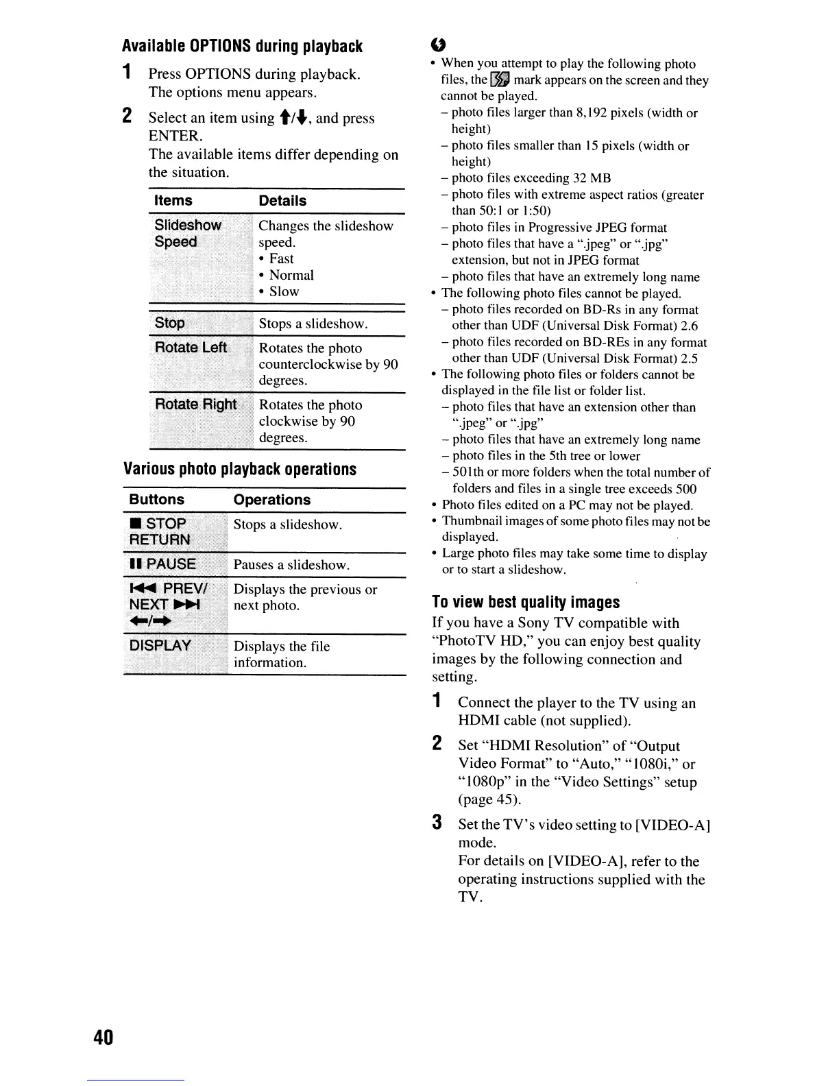 • Photo files edited on a PC may not be played.