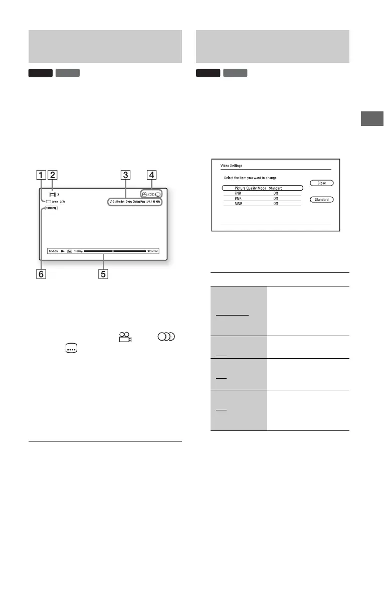 Displays Disc type/Play mode/Video