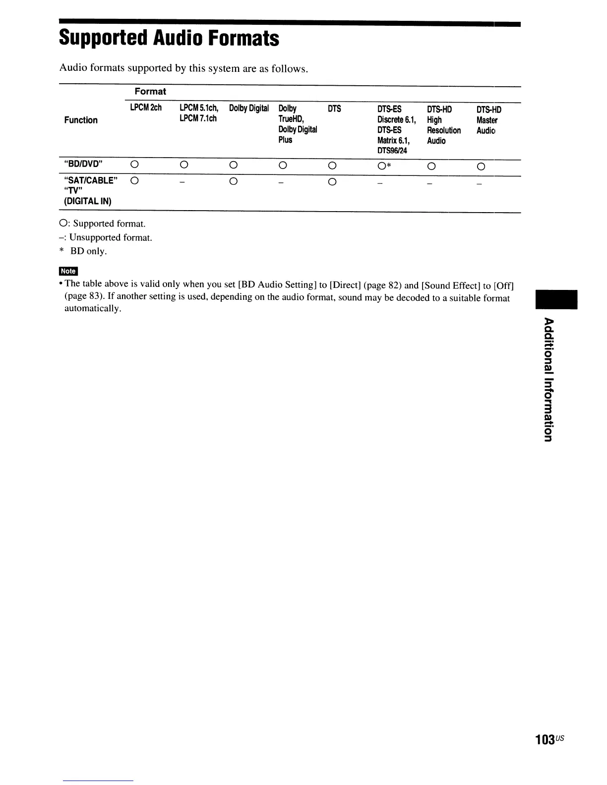 valid only when you set [BD Audio Setting] to [Direct] (page 82) and [Sound Effect] to [Off]