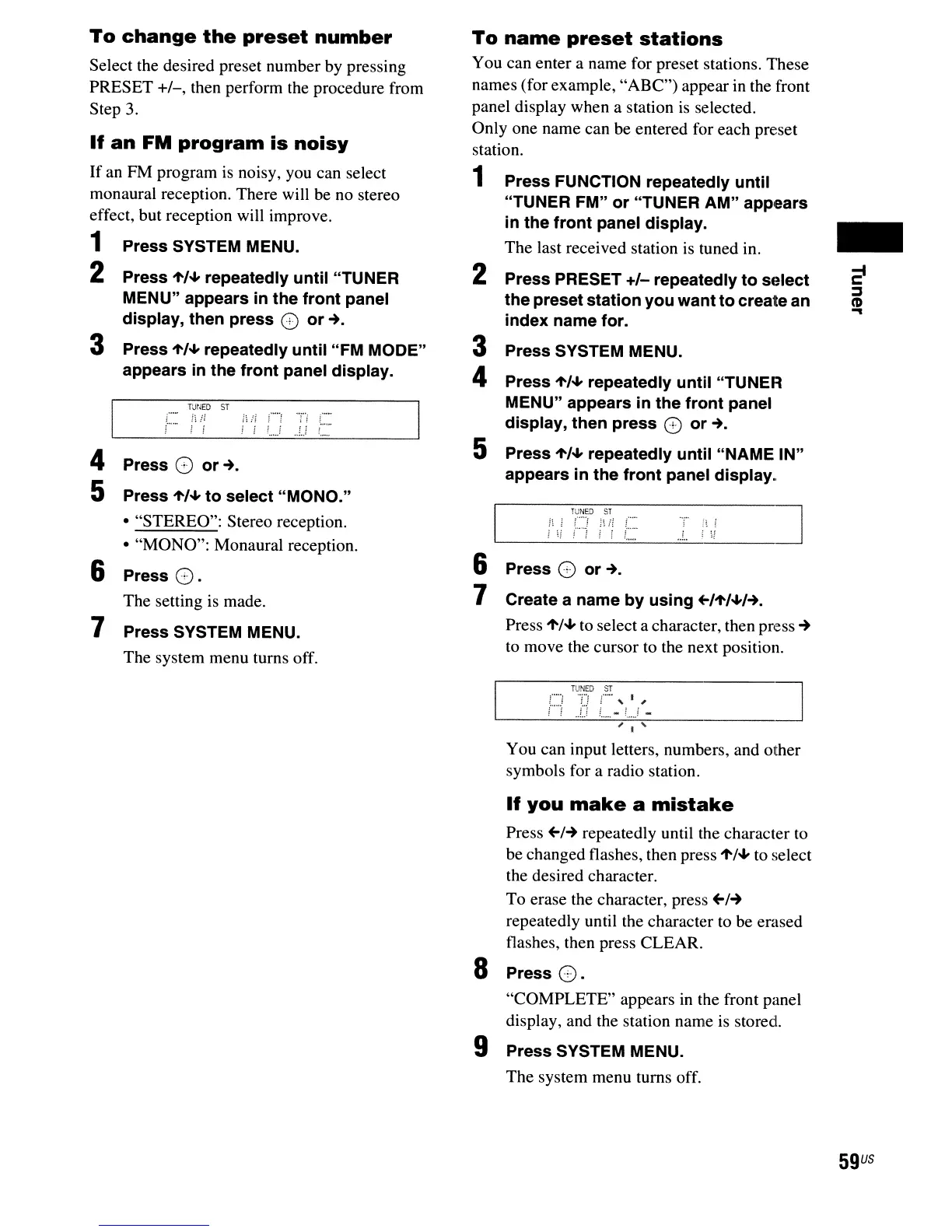 "TUNER FM" or "TUNER AM" appears