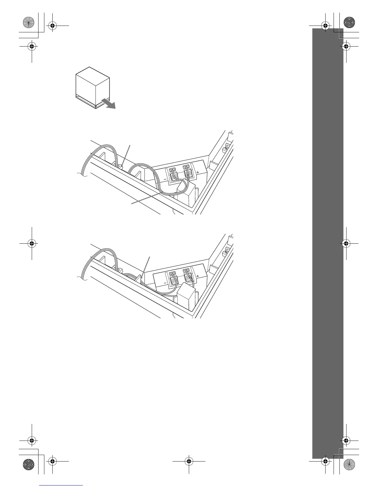 2 Thread the speaker cord through the gap along the side of the subwoofer.