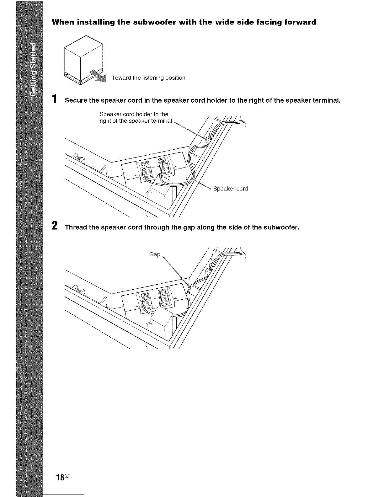 Thread the speaker cord through the gap along the side of the subwoofer.