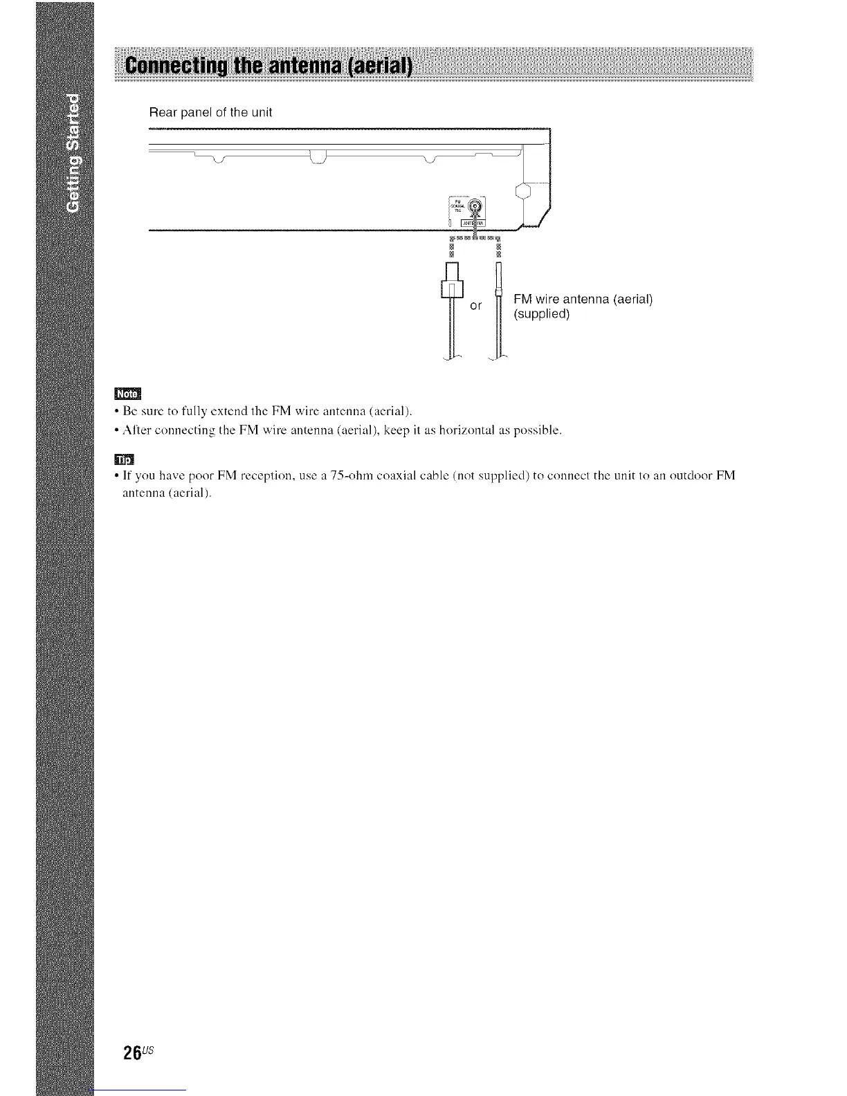 • After connecting the FM wire antenna (aerial), kee l) it as horizontal as possible.