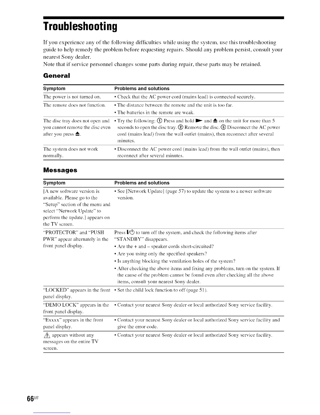 The system does not work • Disconnect the AC power cord (mains lead) from the wall outlet (mains), then
