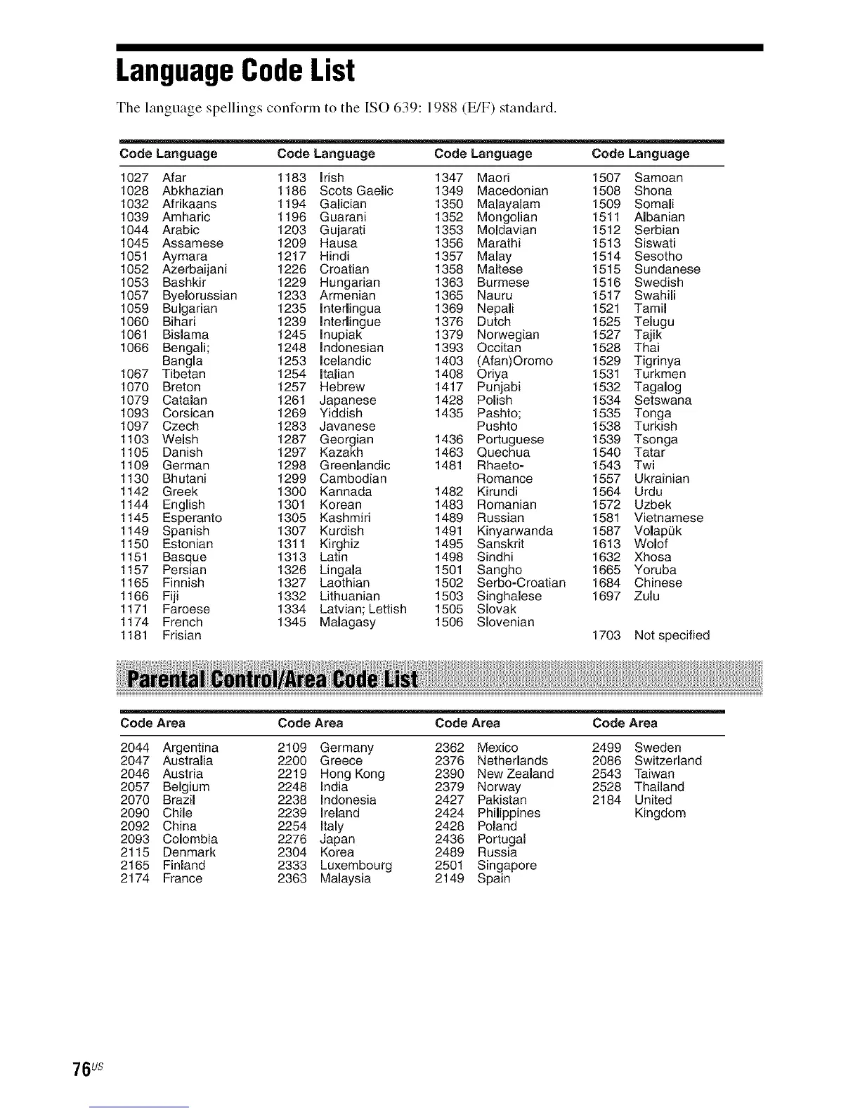 The language spellings conform to the IS() 639:1988 (E/F) standard.