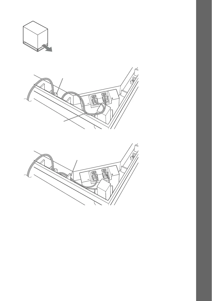 2 Thread the speaker cord through the gap along the side of the subwoofer.