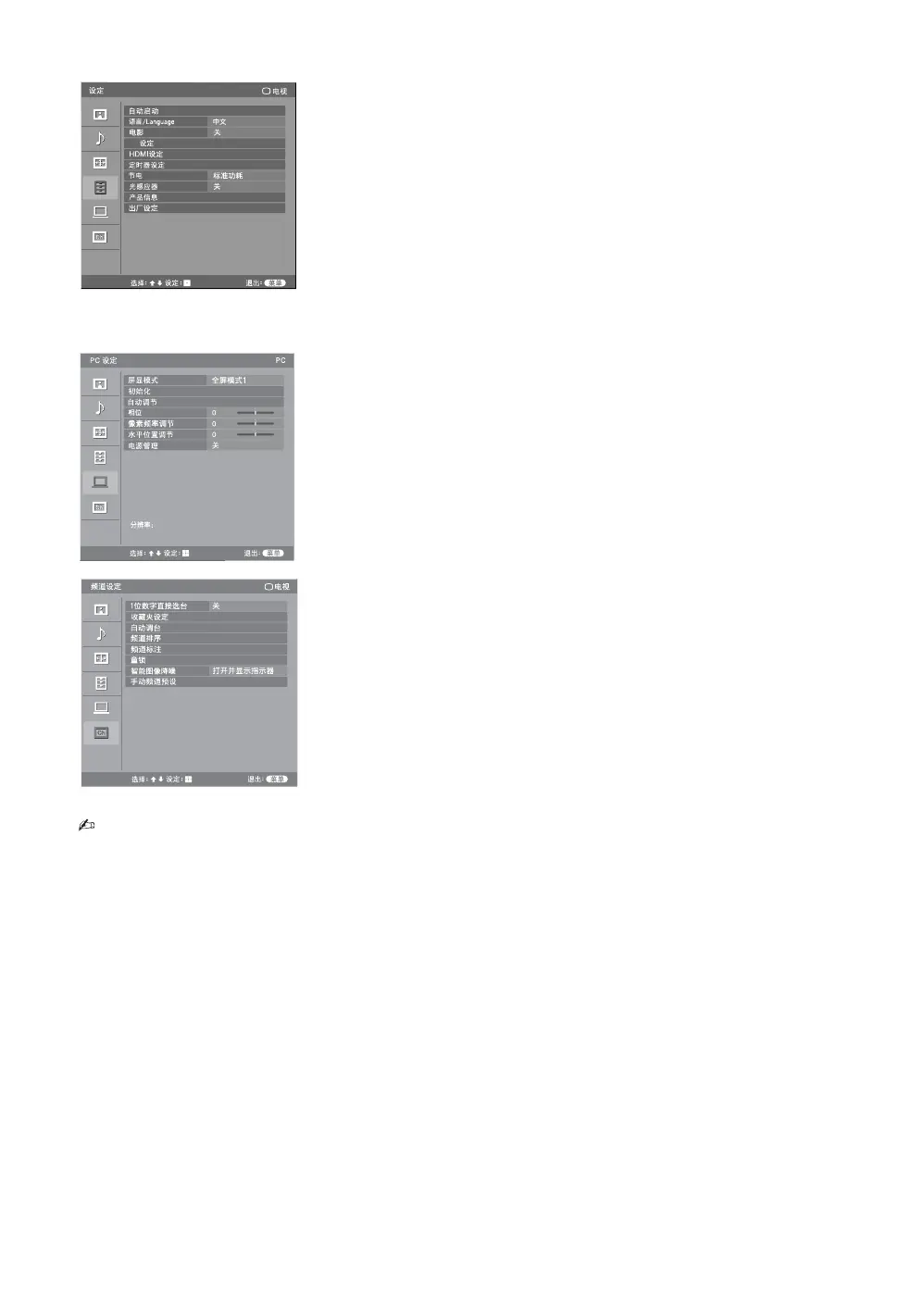 “跳越频道”, “彩色制式”, “信号增强”,