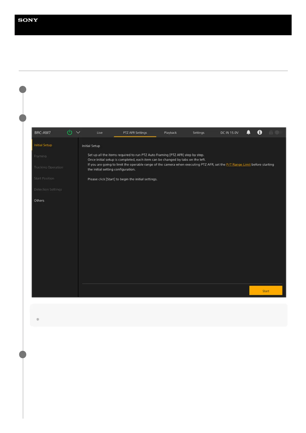 The [Initial Setup] screen of the PTZ AFR setup screen appears.