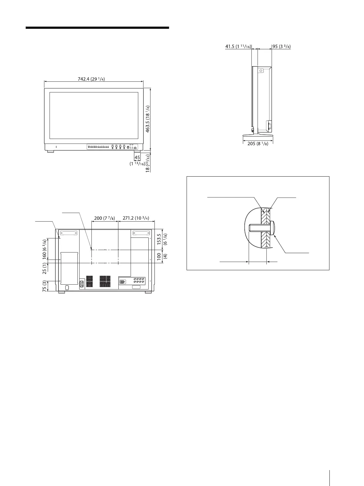 Sony BVM-X300 - Physical Dimensions and Mounting; Front, Rear, and Side Views; Mass and Mounting Screw Information