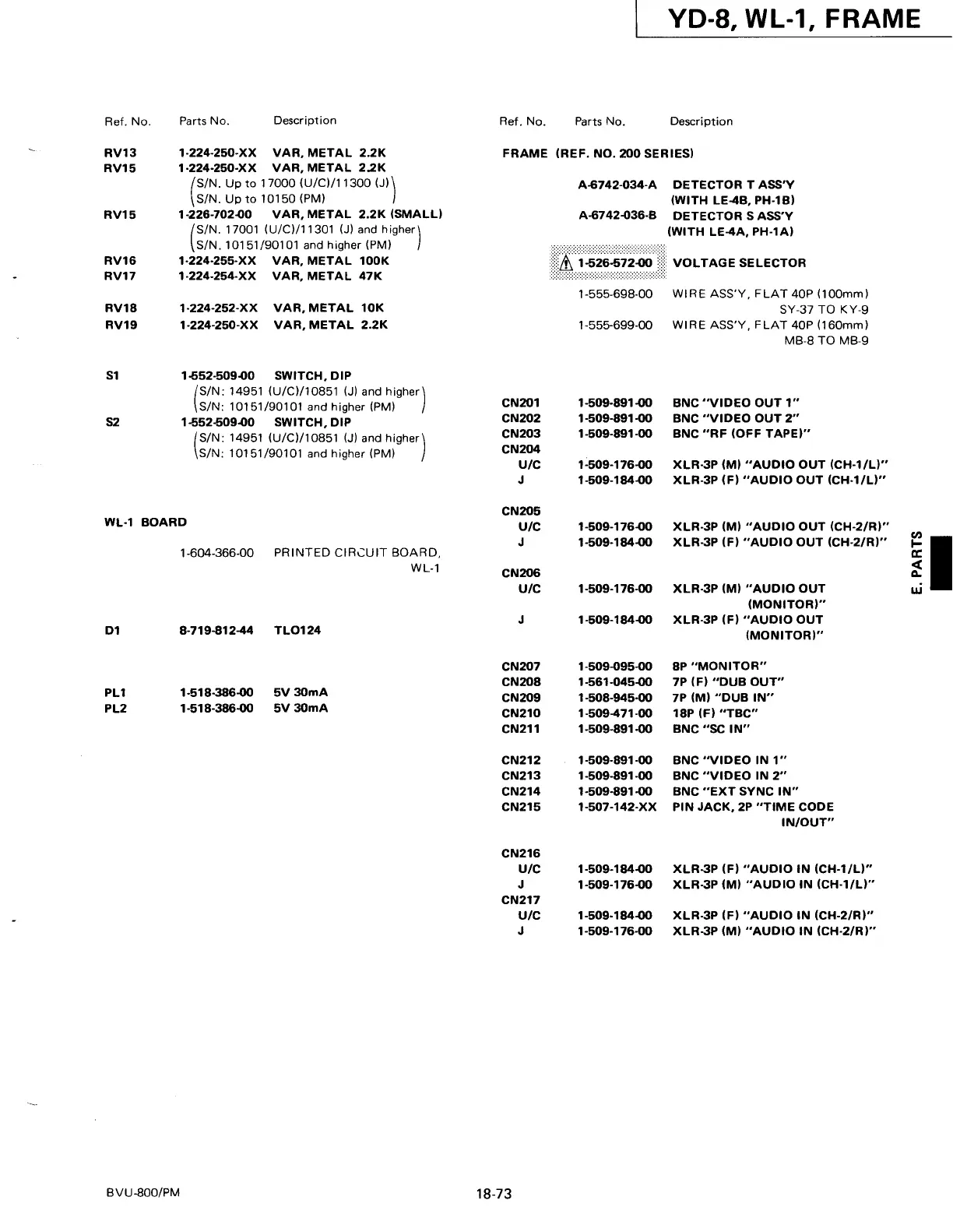 Sony BVU-800 - FRAME COMPONENTS; FRAME Components List