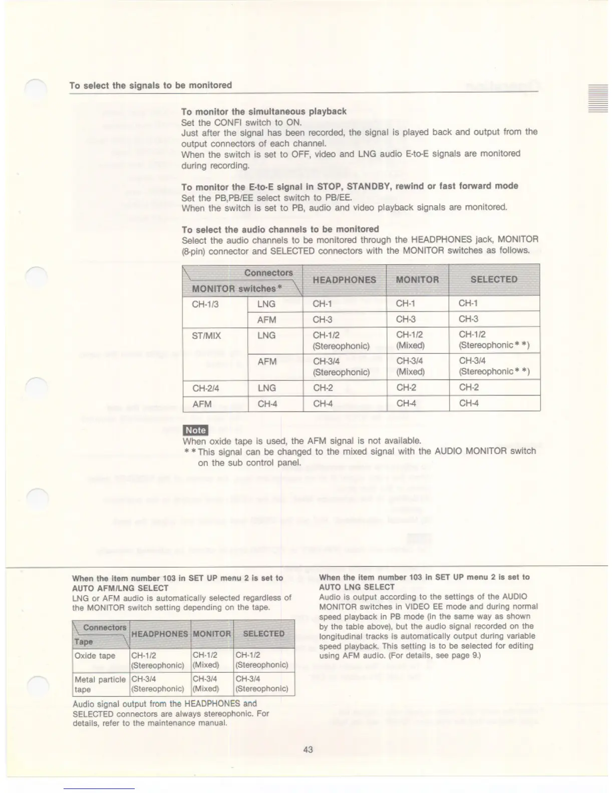 Sony BVW-75 - To Select the Signals to be Monitored; When the Item Number 103 in Set up Menu 2 Is Set to Auto AFM;LNG Select; When the Item Number 103 in Set up Menu 2 Is Set to Auto LNG Select