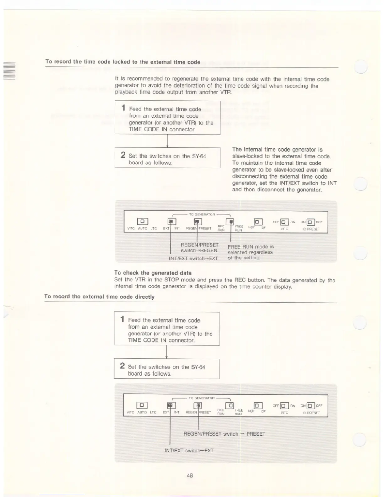 Sony BVW-75 - To Record the Time Code Locked to the External Time Code; To Record the External Time Code Directly