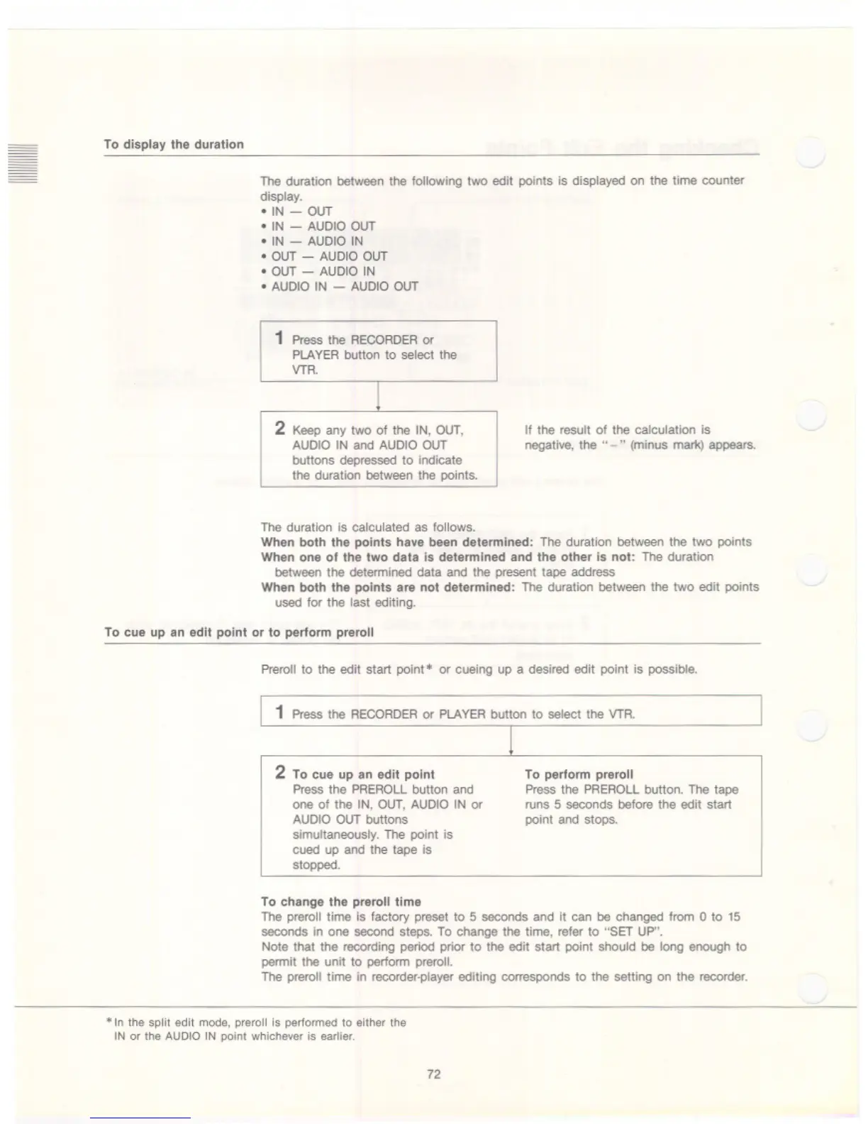 Sony BVW-75 - To Display the Duration; To Cue up an Edit Point or to Perform Preroll; To Change the Preroll Time