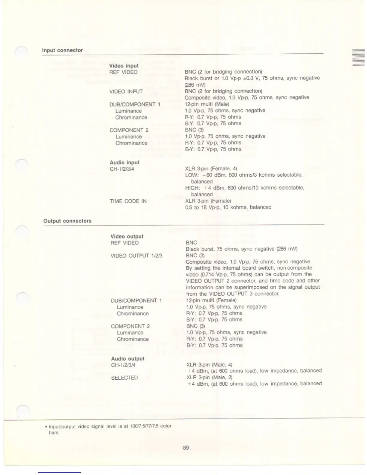 Sony BVW-75 - Connector and Accessory Specifications