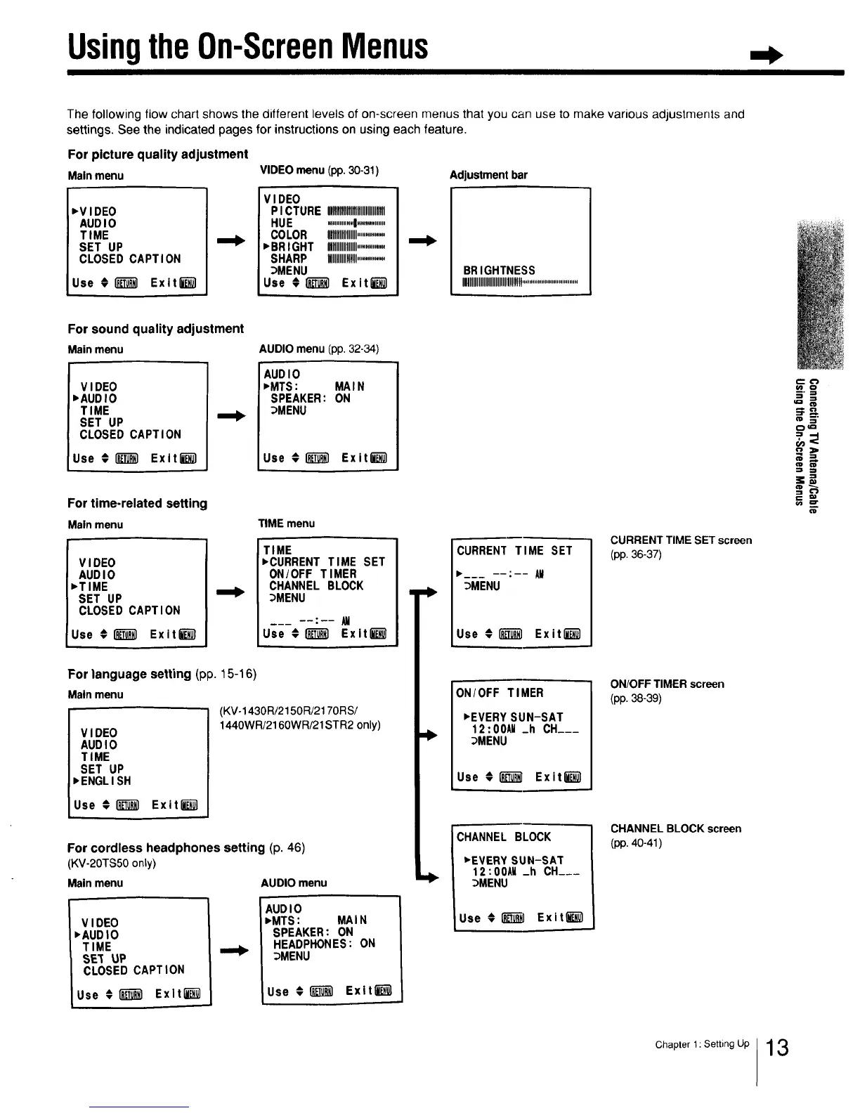 The following flow chart shows the different levels of on-screen menus that you can use to make various adjustments and