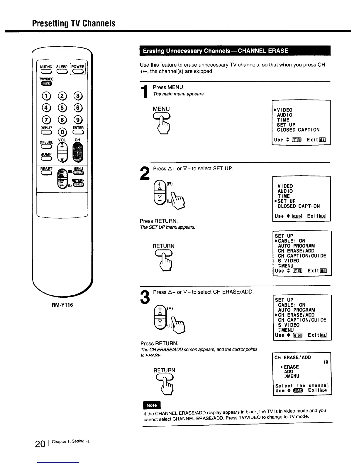 If the CHANNEL ERASE/ADD display appears in black, the TV is in video mode and you