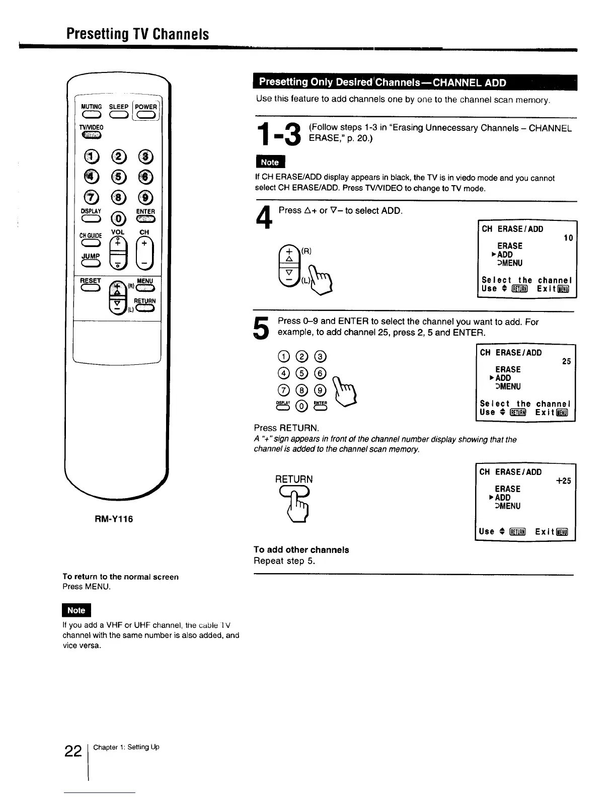 If CH ERASE/ADD display appears in black, the TV is in viedo mode and you cannot