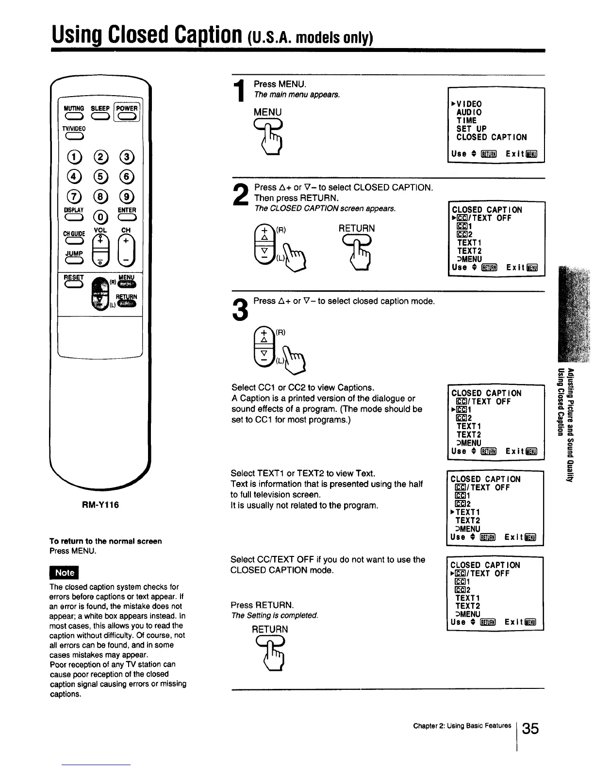Press A+ or V- to select CLOSED CAPTION.Then press RETURN.