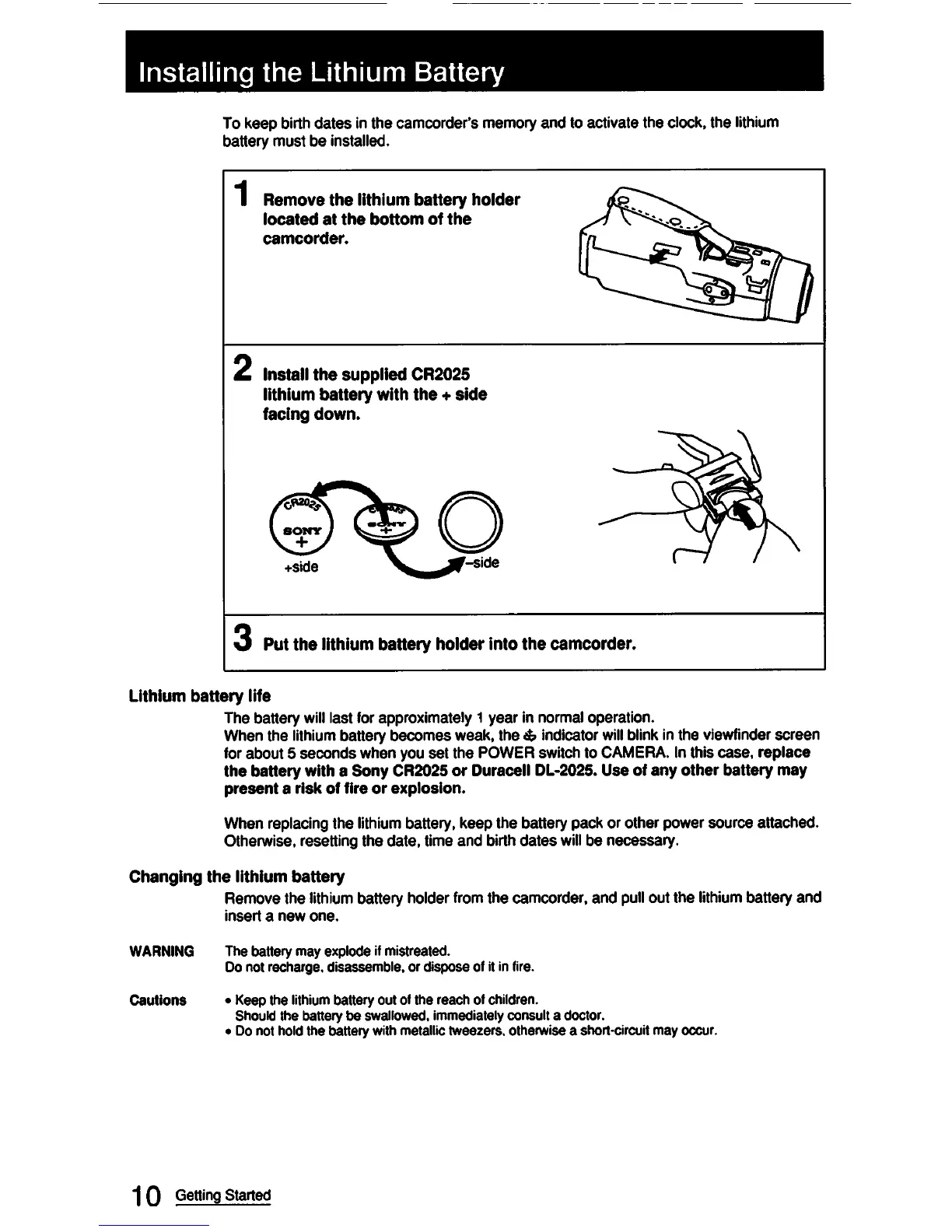 Sony CCD-FX420 - Installing the Lithium Battery; Lithium Battery Life