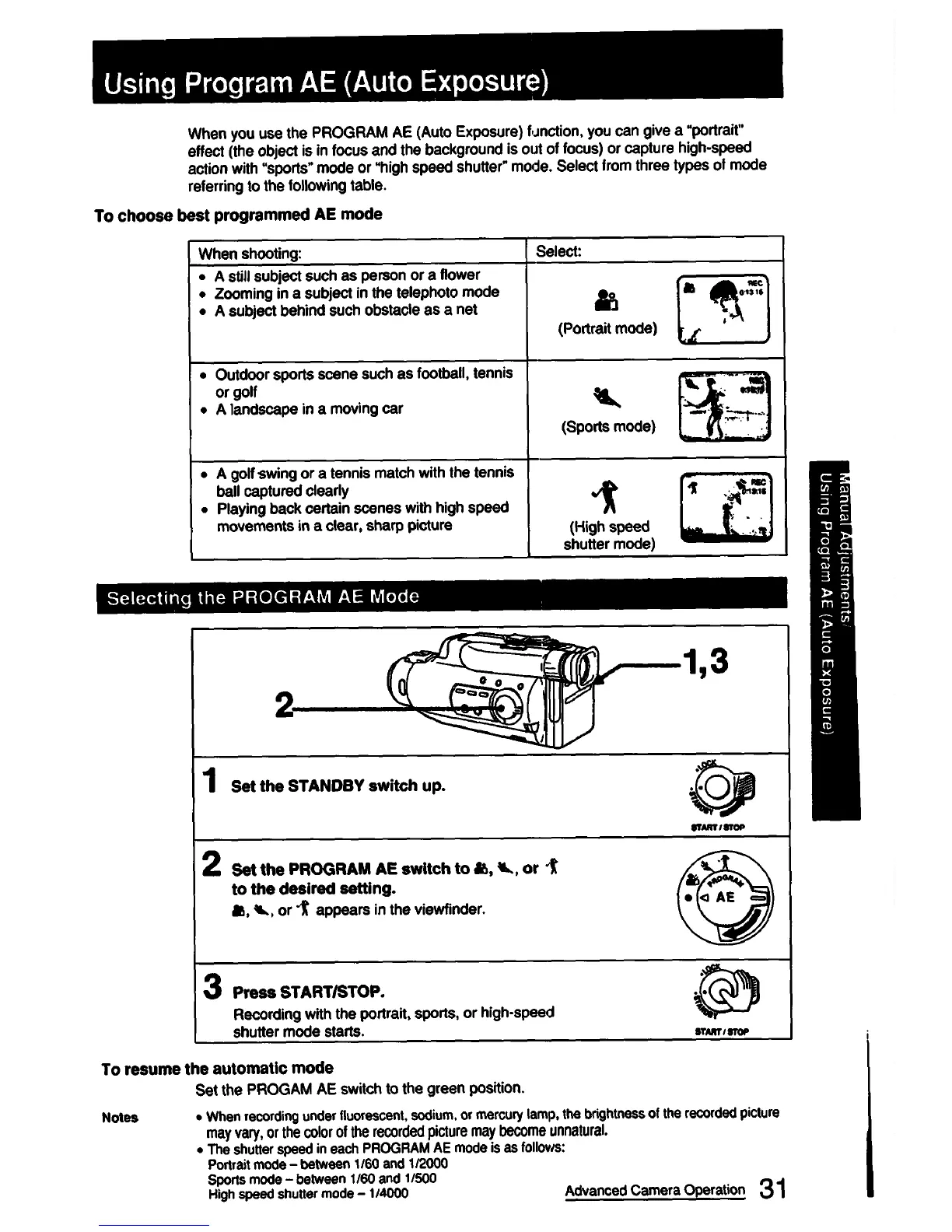 Sony CCD-FX420 - Program AE Modes; Selecting Program AE Mode