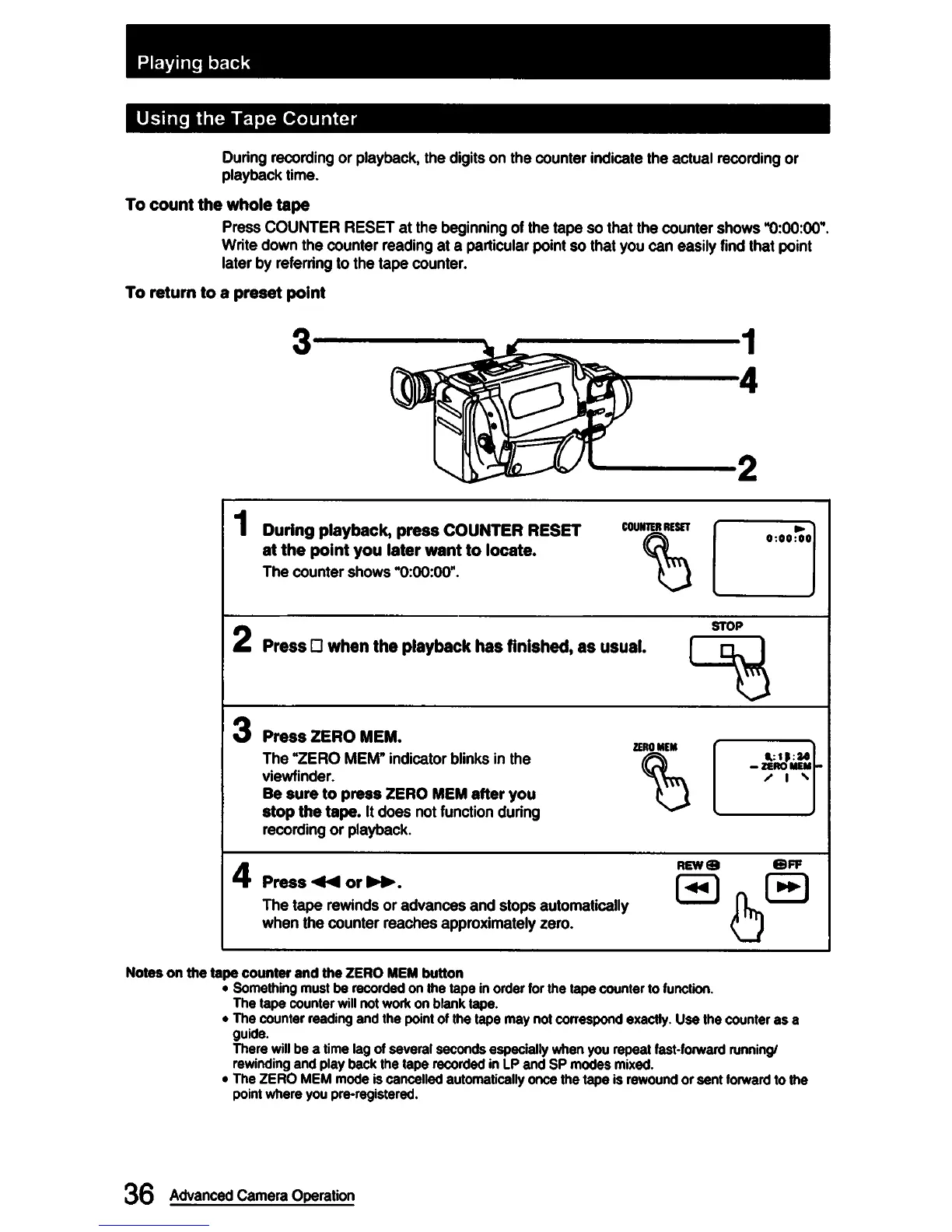 Sony CCD-FX420 - Using the Tape Counter; To Count the Whole Tape; To Return to a Preset Point