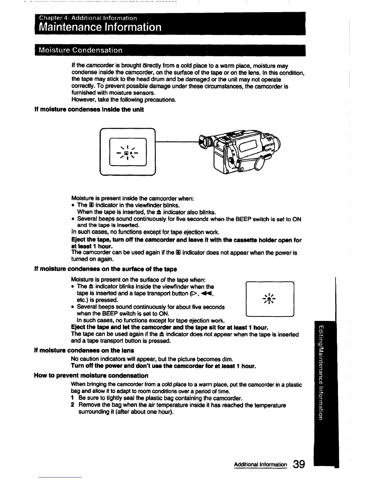 Sony CCD-FX420 - Maintenance Information; Moisture Condensation; If Moisture Condenses Inside the Unit; If Moisture Condenses on the Surface of the Tape