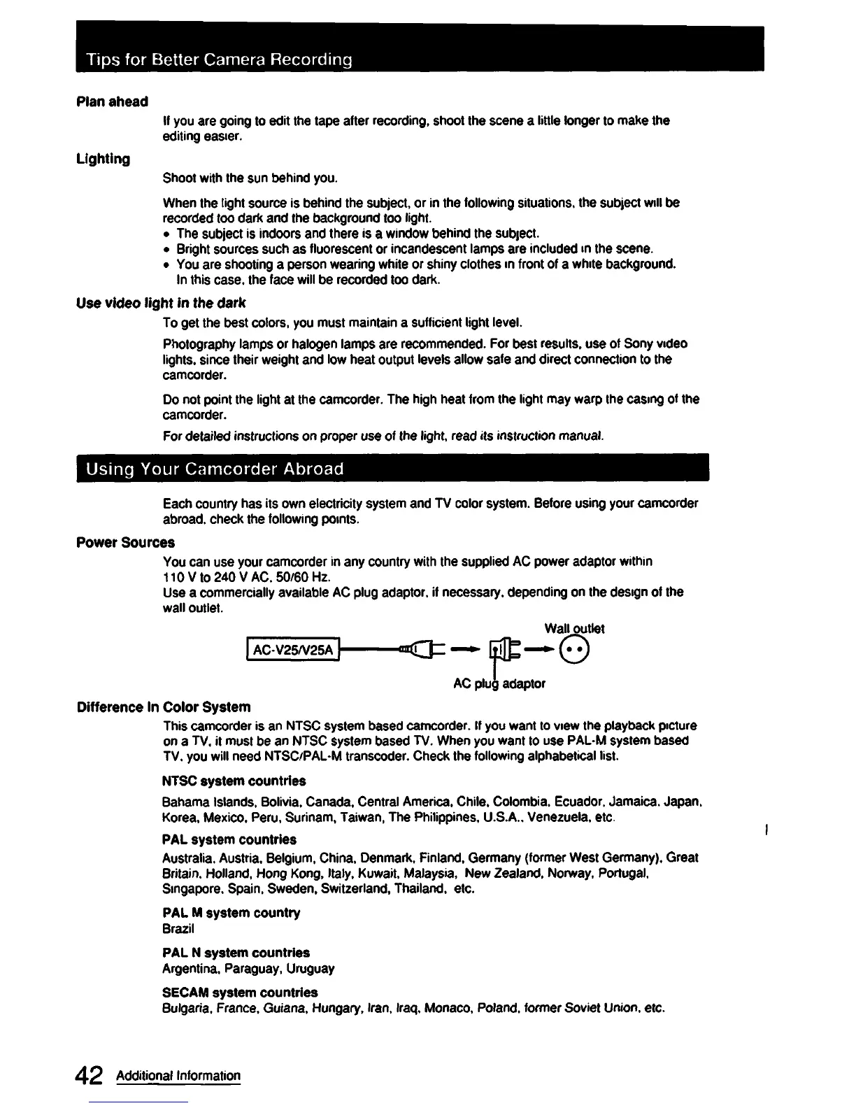 Sony CCD-FX420 - Using Your Camcorder Abroad; Power Sources; Difference in Color System; Lighting
