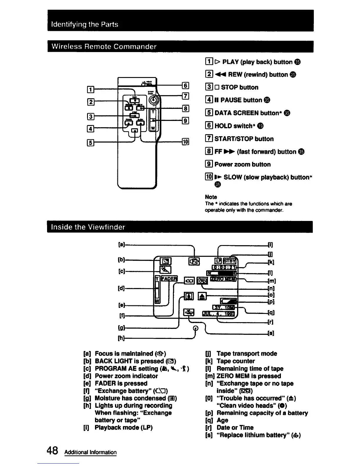 Sony CCD-FX420 - Remote Commander and Viewfinder Indicators; Wireless Remote Commander Controls; Viewfinder Indicator Guide