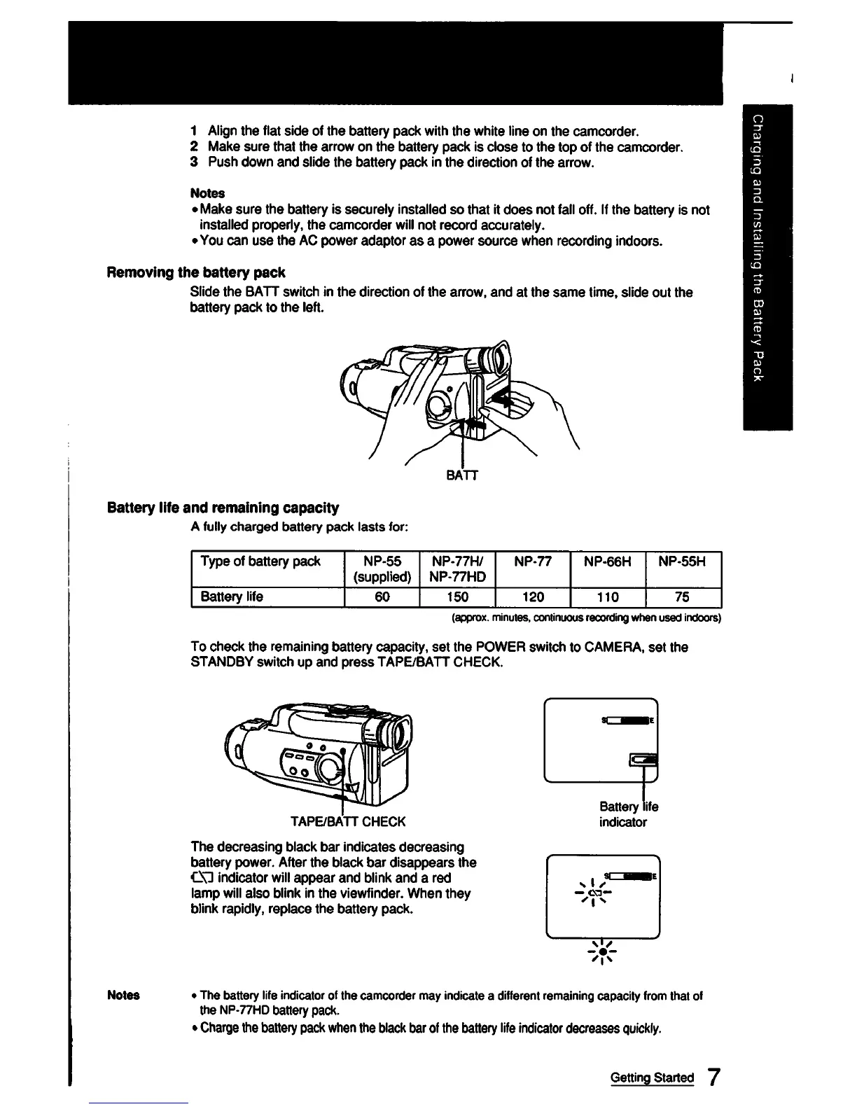 Sony CCD-FX420 - Removing the Battery Pack; Battery Life and Remaining Capacity