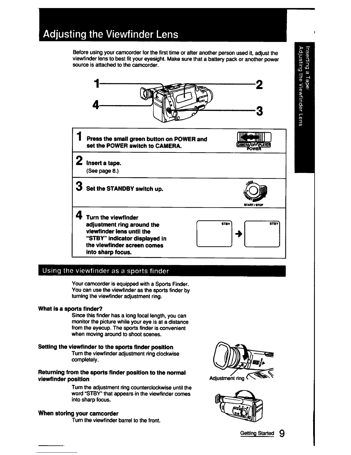 Sony CCD-FX420 - Adjusting the Viewfinder Lens; Using the Viewfinder as a Sports Finder; What Is a Sports Finder?; When Storing Your Camcorder