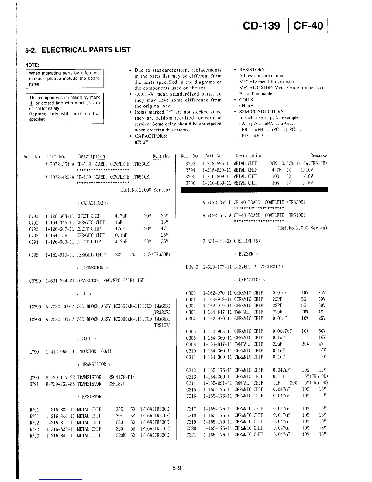 Sony CCD-TR330E - Electrical Parts List
