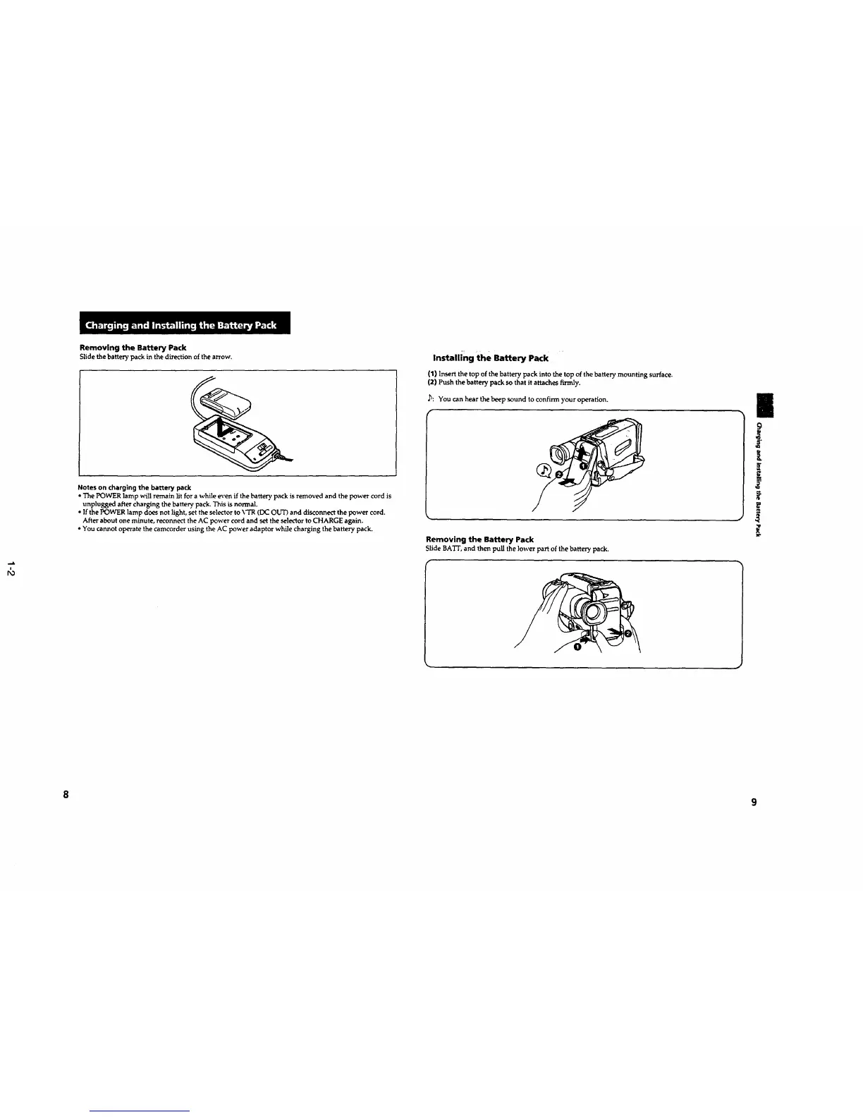 • The POWER lamp will remain lit for a while even if thebattery pack is removed and thepower cord is