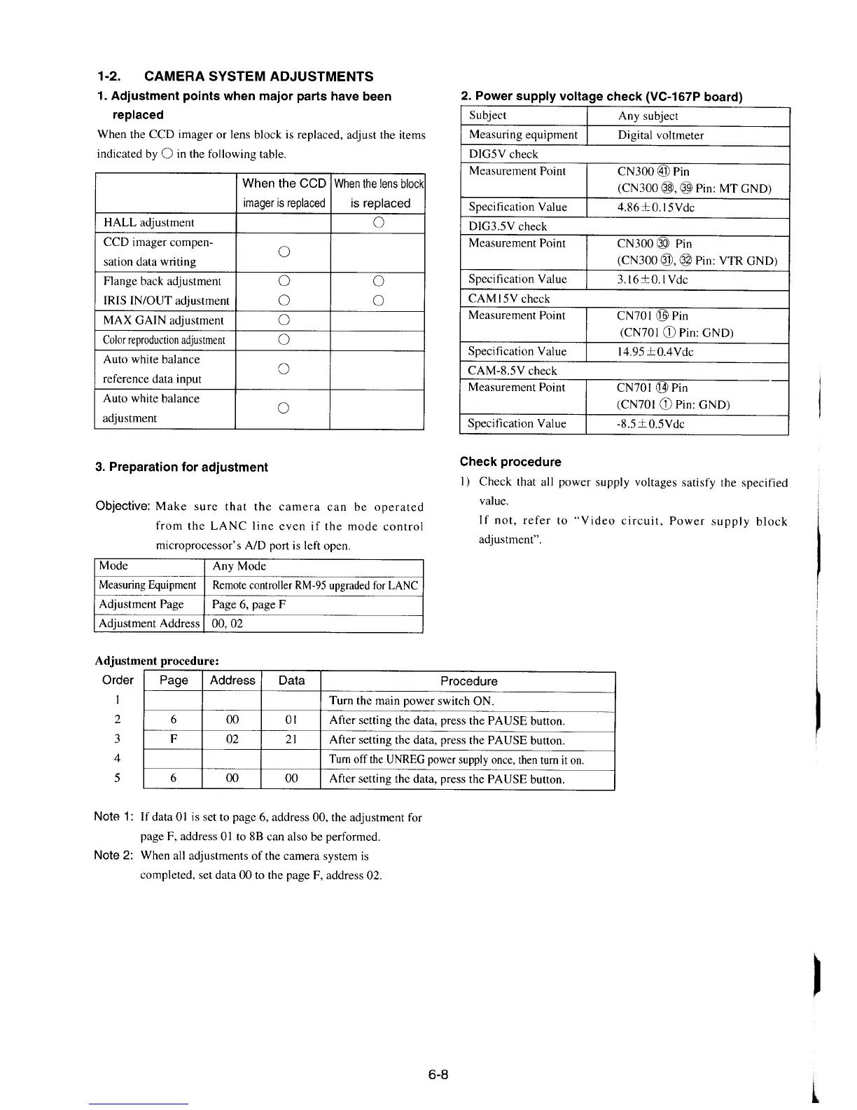 Sony CCD-TR510E - Adjustment Points When Major Parts Have Been Replaced; Preparation for Camera System Adjustment; Power Supply Voltage Check(VC-167 P Board)