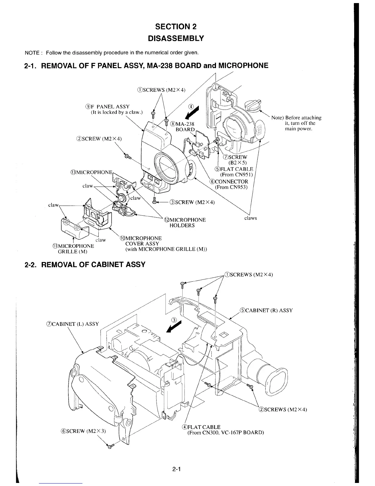 Sony CCD-TR510E - Disassembly; Removal of F Panel Assy, MA-238 Board and Microphone; Removal of Cabinet Assy