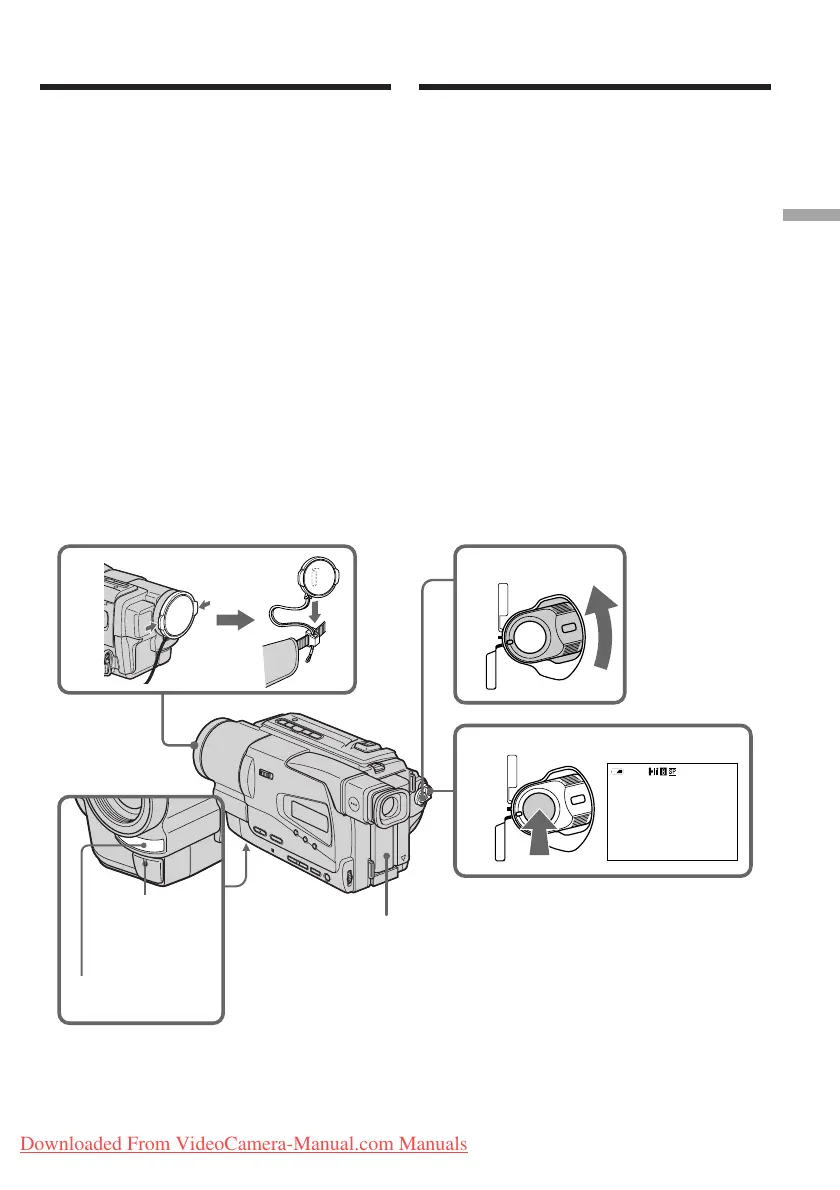 (1)Снимите крышку объектива, нажав обе