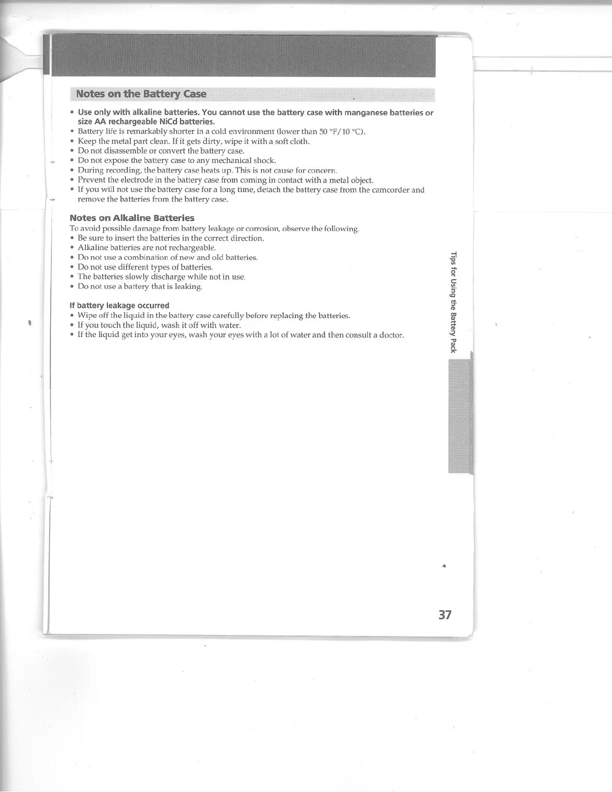 Sony CCD-TR74 - Notes on Alkaline Batteries; If Battery Leakage Occured