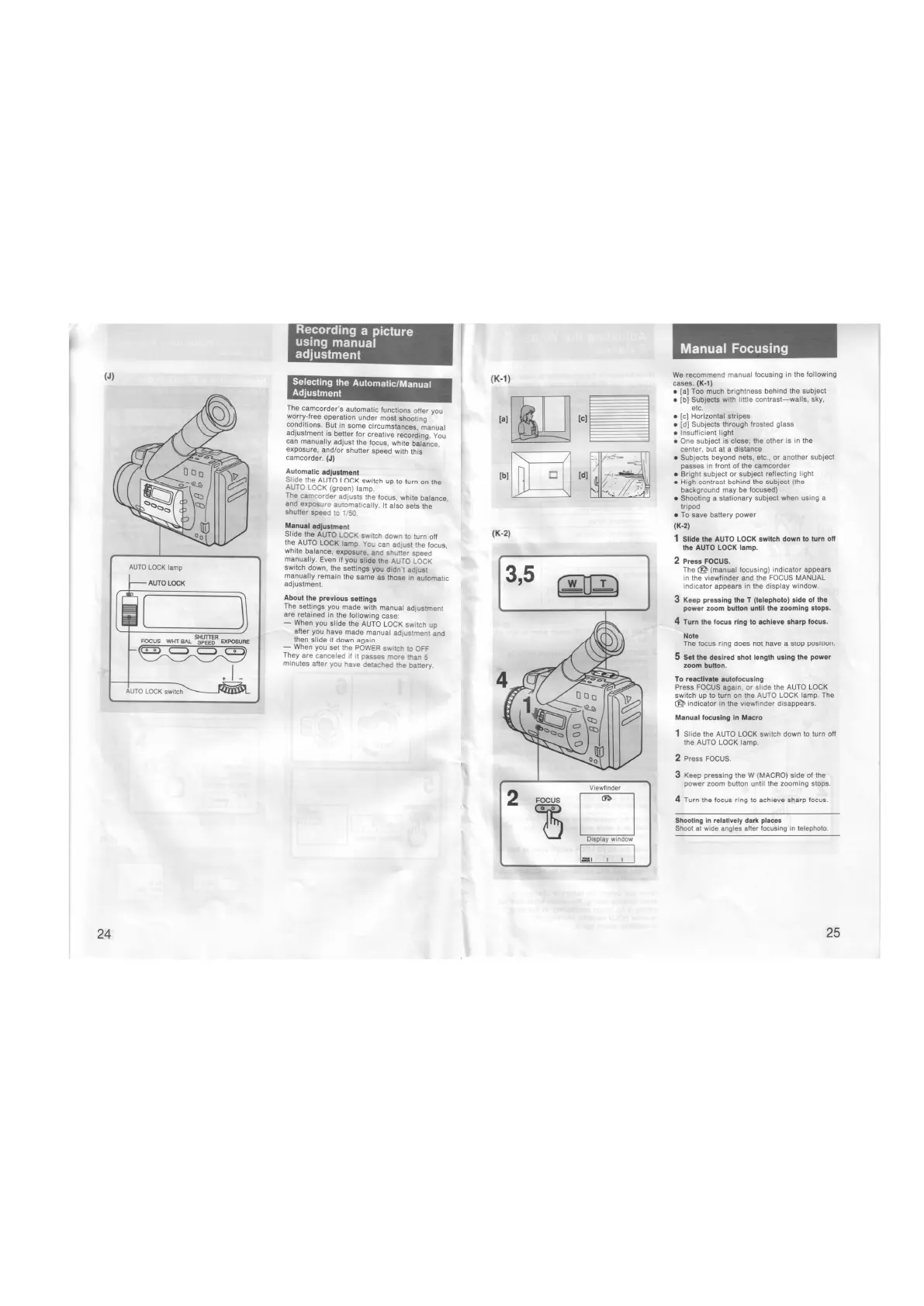 Sony CCD-TR805E - Recording with Manual Adjustments; Selecting Auto;Manual Adjustment; Manual Focusing
