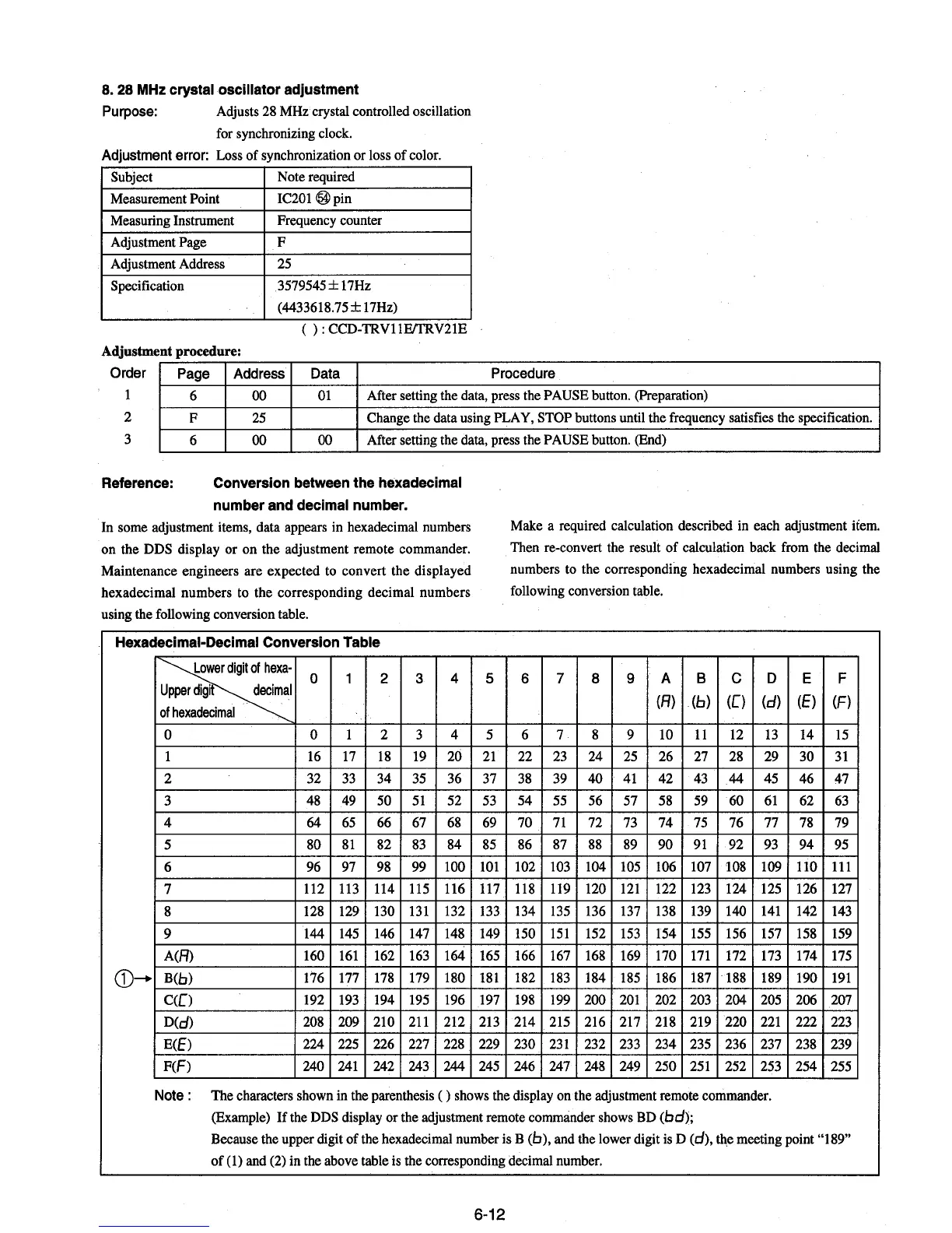 Sony CCD-TRV11 - 28 Mhz Crystal Oscillator Adjustment; Hexadecimal-Decimal Conversion Table