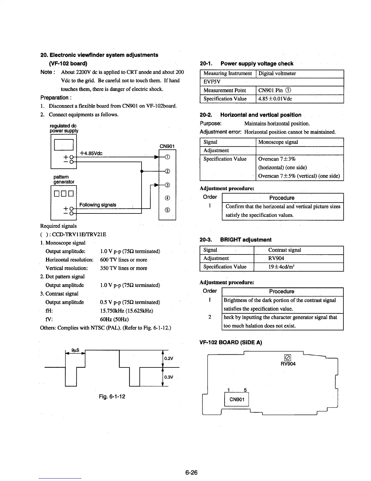 Sony CCD-TRV11 - Electronic Viewfinder System Adjustments; Horizontal and Vertical Position; Bright Adjustment; VF-102 Board