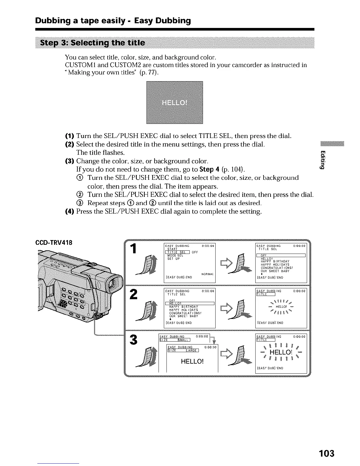 (1) Turn the SEL/PUSH EXEC dial to select TITLE SEL, then press the dial.
