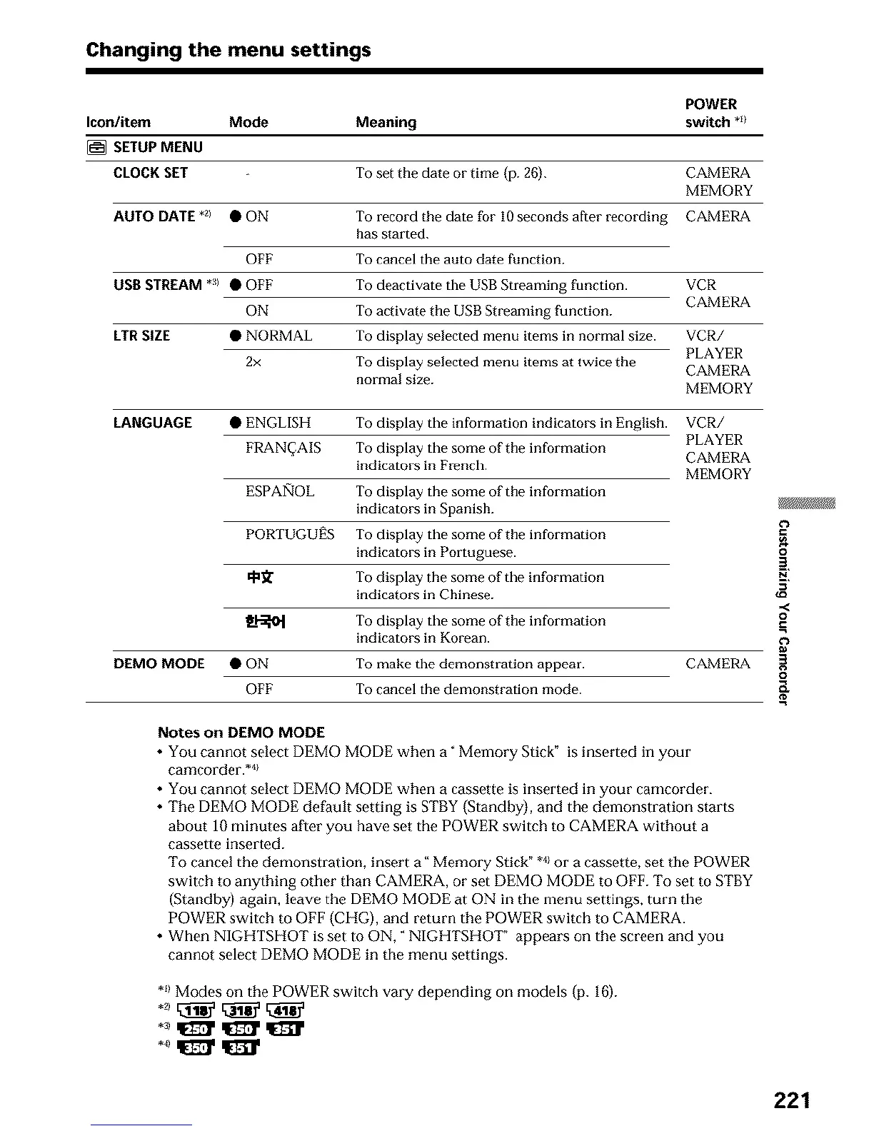 To cancel the demonstration, insert a" Memory Stick" *4}or a cassette, set the POWER
