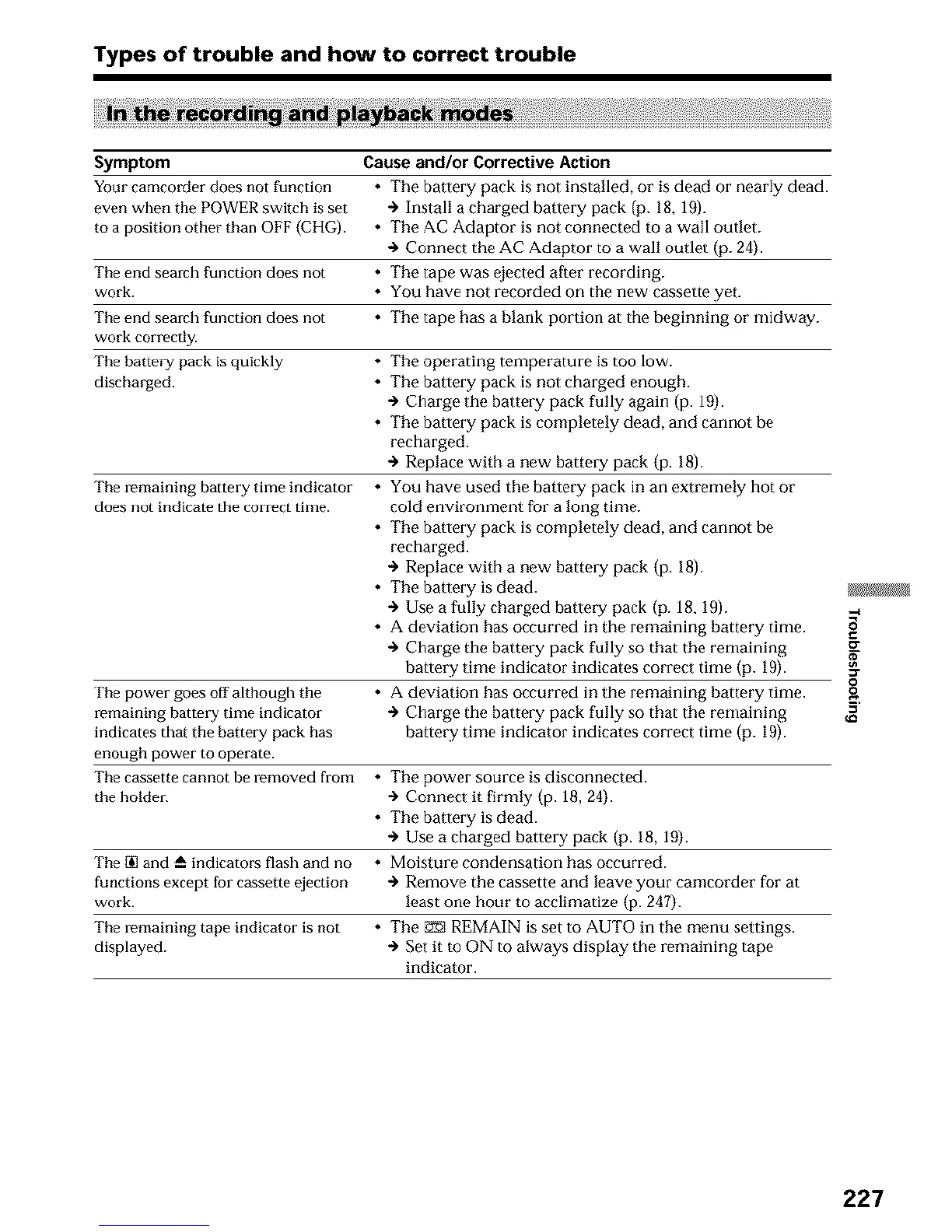 Your camcorder does not function • The battery pack is not installed, or is dead oi' nearly dead.